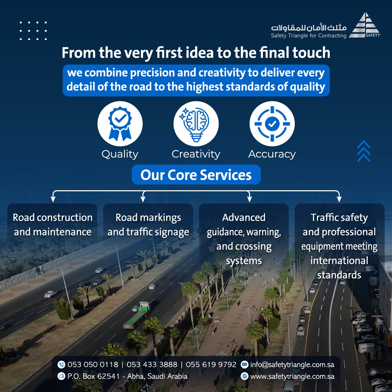 تقدم شركة مثلث الأمان للمقاولات العامة مجموعة متكاملة من الخدمات في قطاع الطرق والبنية التحتية، وتشمل: