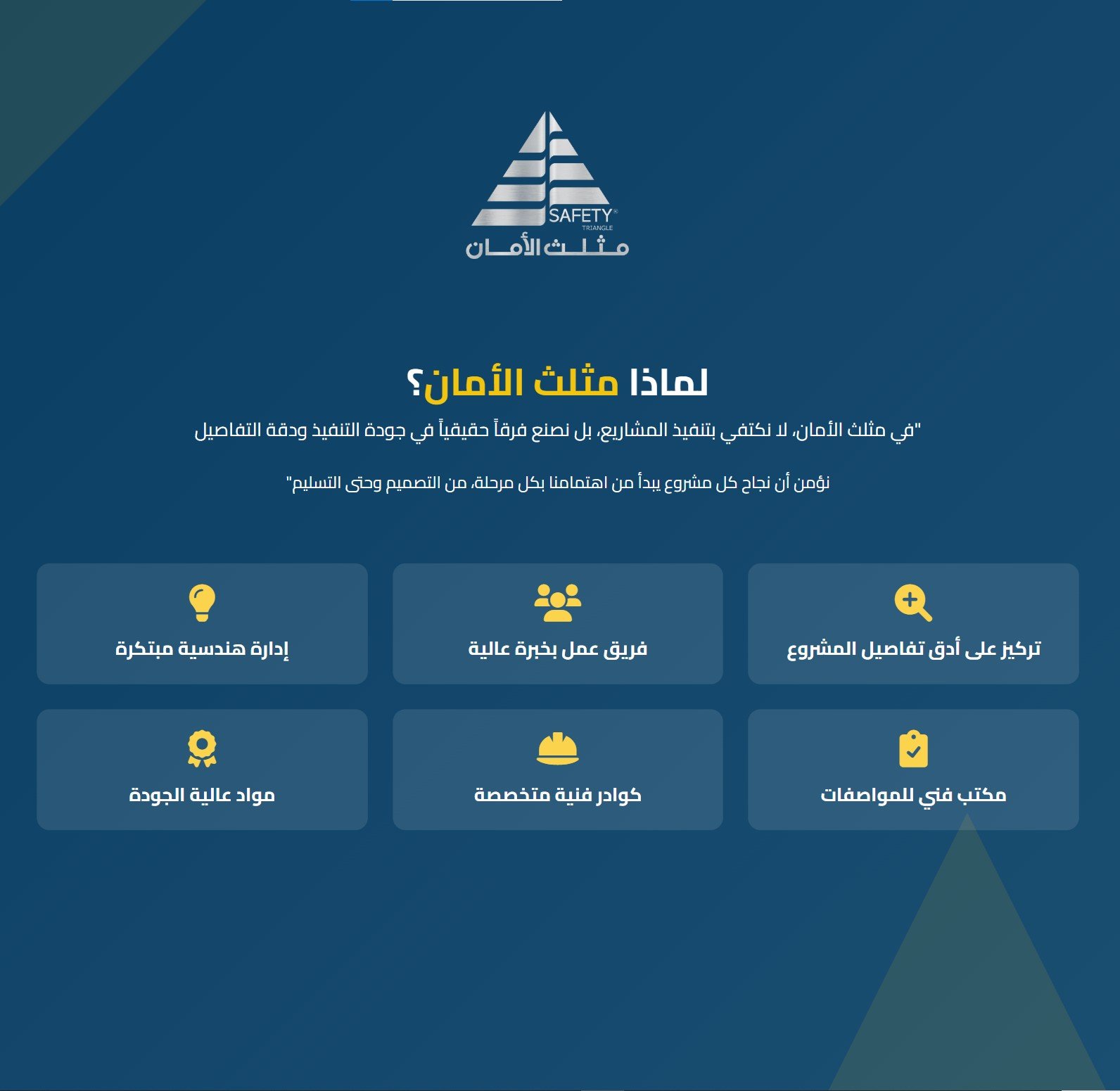 تأسست شركة مثلث الأمان للمقاولات العامة برؤية واضحة تهدف إلى الإسهام في تطوير البنية التحتية للمملكة العربية السعودية، تماشياً مع مستهدفات التنمية الوطنية. حصلت الشركة على تصنيف مقاول طرق من الدرجة الثالثة من قبل وزارة الشؤون البلدية والقروية، كما أنها مؤهلة من وزارة النقل في مجال السلامة المرورية، الأمر الذي يعكس التزامها بأعلى معايير الجودة والسلامة في تنفيذ المشاريع.